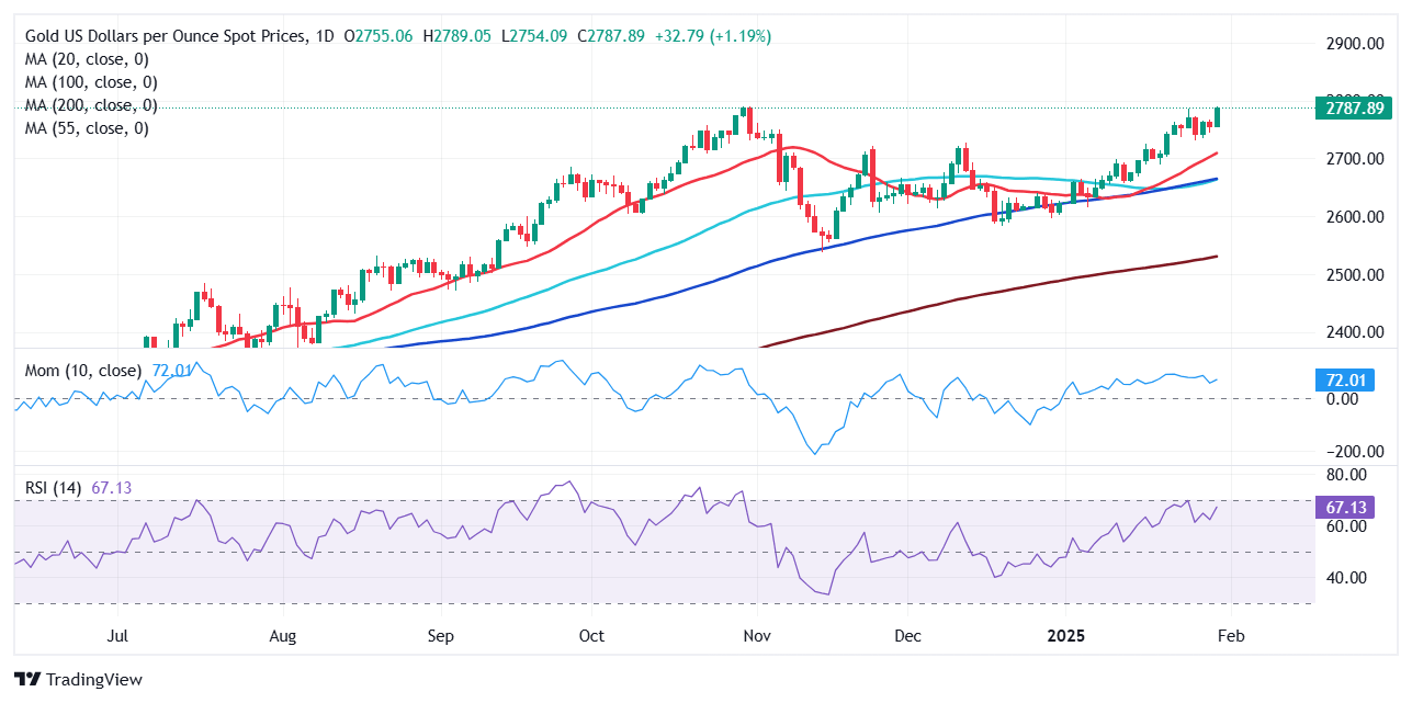 XAU/USD trades dangerously close to its record high in the $2,790 region as the latest macroeconomic developments put pressure on the US Dollar (USD).