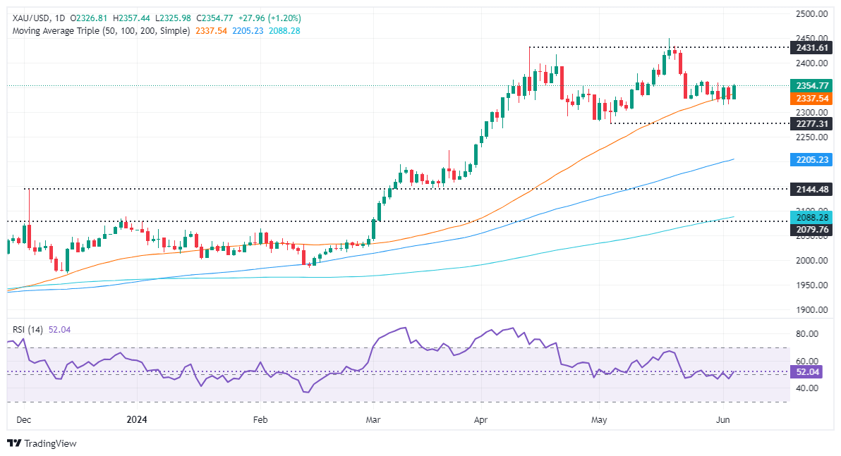 Gold’s price remains range-bound and advanced on Wednesday, making a U-turn to Tuesday’s price action following the release of mixed US economic data that could warrant lower borrowing costs set by the US Federal Reserve (Fed). Therefore, US Treasury yields dropped, and the Greenback rose, yet failed to put a lid on the yellow metal. The XAU/USD trades at $2,353, up 1.18%.