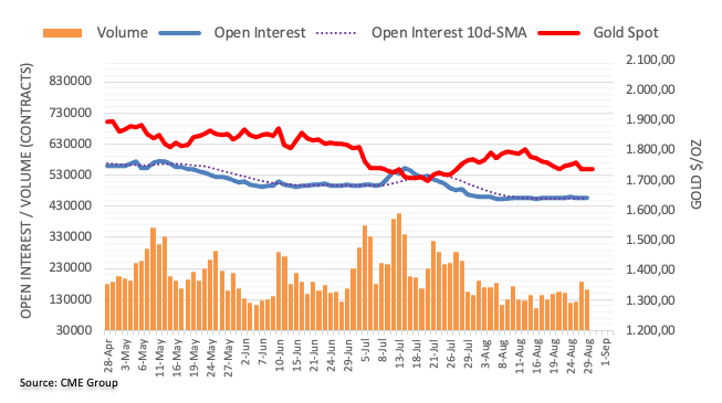 Gold prices charted an inconclusive session at the beginning of the week amidst a small uptick in open interest. That said, further weakness should not be ruled out while the next support now emerges at $1,711 per ounce troy (weekly low July 27).