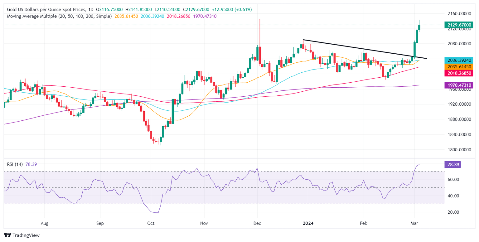 Gold is skyrocketing, though it has retreated from ATH seen at $2,141.59, which could open the door for a pullback. In that event, XAU/USD’s first support would be the $2,100.00 mark, followed by the December 28 high at $2,088.48 and the February 1 high at $2,065.60.