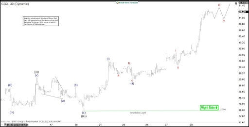 Short Term Elliott Wave in Gold Miners Junior (GDX) suggests rally from 11.10.2023 low is in progress as a 5 waves impulse. Up from 11.10.2023 low, wave ((i)) ended at 29.07 as the 1 hour chart below shows. Dips in wave (ii) unfolded as a zigzag Elliott Wave structure. Down from wave ((i)), wave (a) ended at 28.38 and wave (b) rally ended at 28.75. Wave (c) lower ended at 27.98 which completed wave ((ii)) in higher degree.