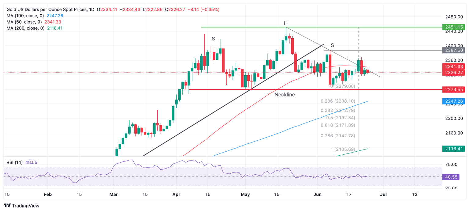 Although Gold decisively broke above a key resistance level at the 50-day Simple Moving Average (SMA) and a trendline connecting the May 7 and June 20 highs, it failed to follow through. The precious metal only managed to rally up to a peak at $2,369 on June 21 before rolling over suddenly and plummeting. It has now fallen back below the trendline it originally breached.