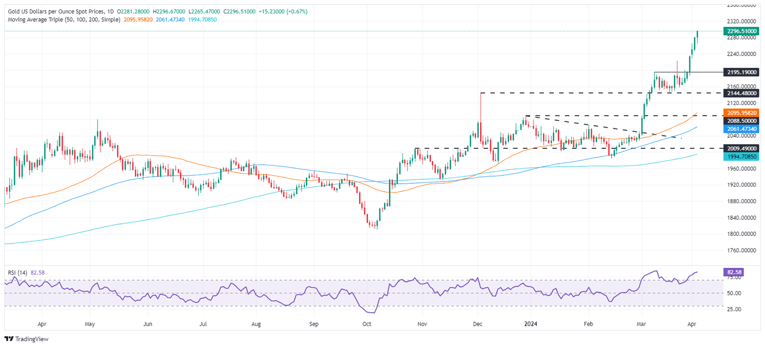 The XAU/USD daily chart suggests the yellow metal is headed toward the $2,300 figure amid renewed buying pressures observed in the Relative Strength Index (RSI). On Monday, I mentioned that “The XAU/USD daily chart depicts Gold's last uptick to new all-time highs, achieved on lower momentum, as depicted by the Relative Strength Index (RSI).” However, as of writing, the RSI has punched above the 80.00 threshold, an indication that buyers are in charge.