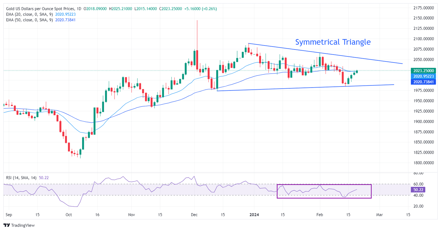 Gold price continues its winning spell for the fourth straight trading session. The precious metal attempts to deliver a decisive break above the 20 and 50-day Exponential Moving Averages (EMAs), which trade around $2,020.