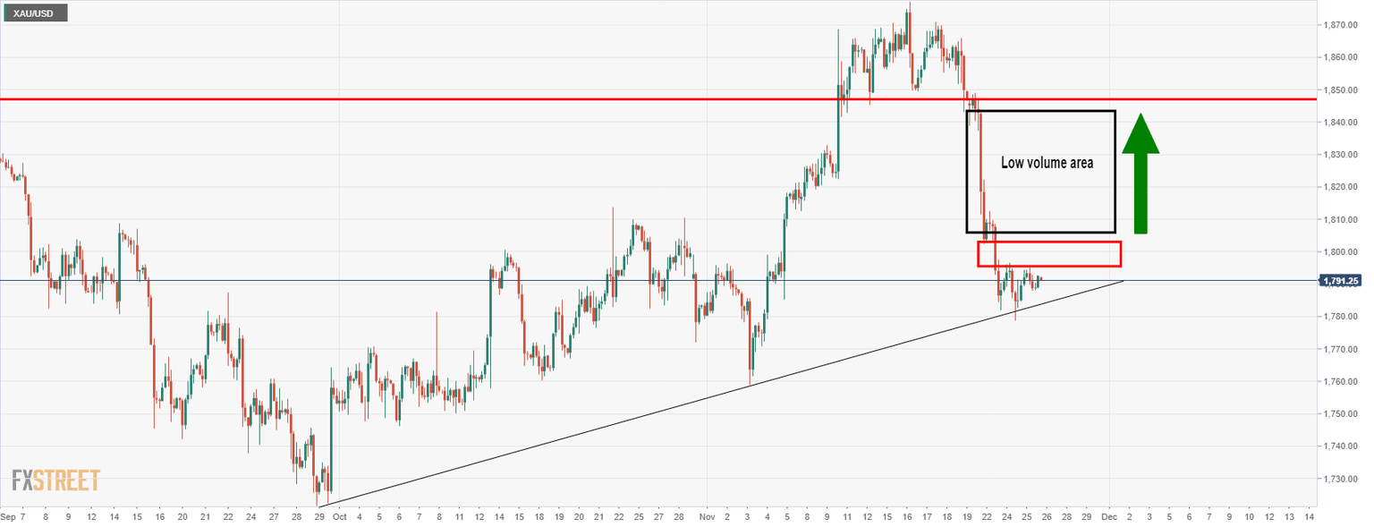 The bears are in charge, but there appears to be consolidation taking form and there could be a test of the upside between now and the next critical events surrounding the Fed. Additionally, EUR/USD, (euro is the largest component of the DXY index) has fallen towards a retest the monthly counter-trendline. If this holds, then the dollar could be in for a significant correction which would be expected to support gold prices. Still, there is room to go until the trendline is met. However, the horizontal support could lead to a meanwhile correction in EUR/USD.