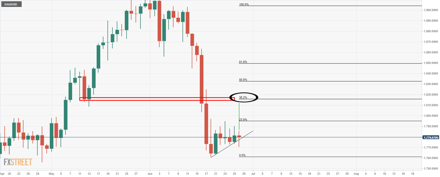 At the time of writing, XAU/USD is trading at $1,778.63, down -0.17% after sliding from a high of $1,785.83 to a low of $1,770.78.