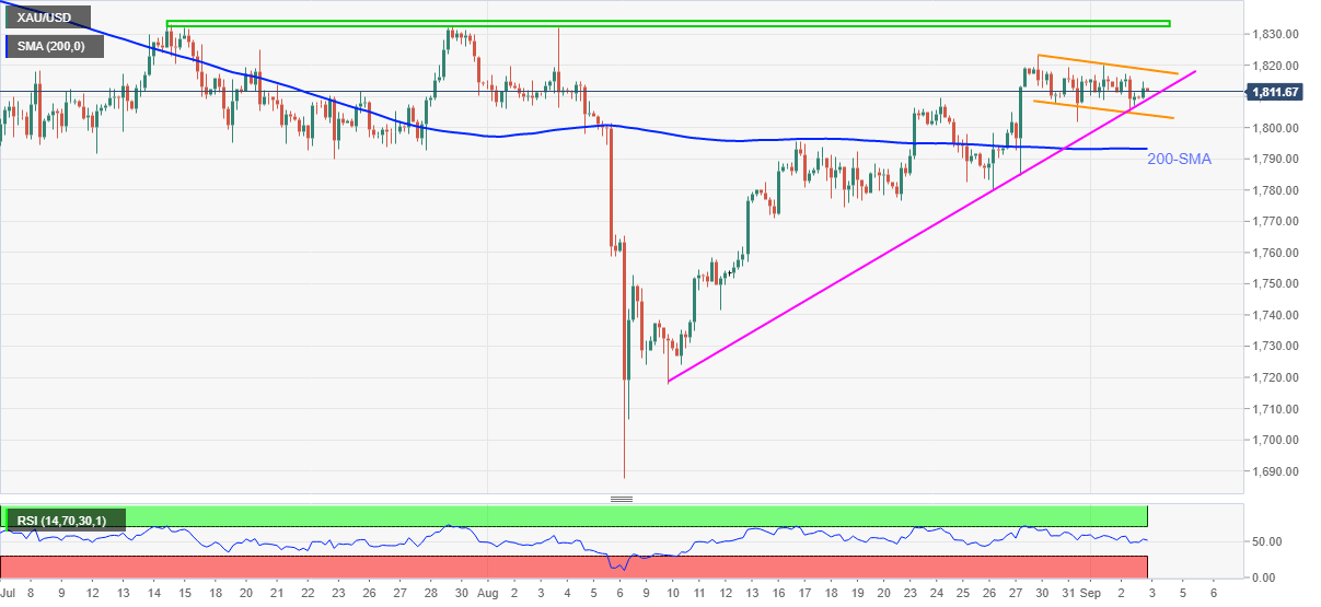 On the other hand, a downside break of the immediate support line from August 10, near $1,809, will drag the quote to the flag’s lower line near $1,804.