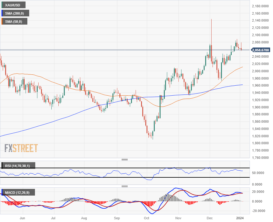 On the daily candlesticks, XAU/USD remains on the high side, but the bottom is opening up as Gold bugs continue to struggle to hoist Spot Gold back into early December’s rally into all-time-highs near $2,140.