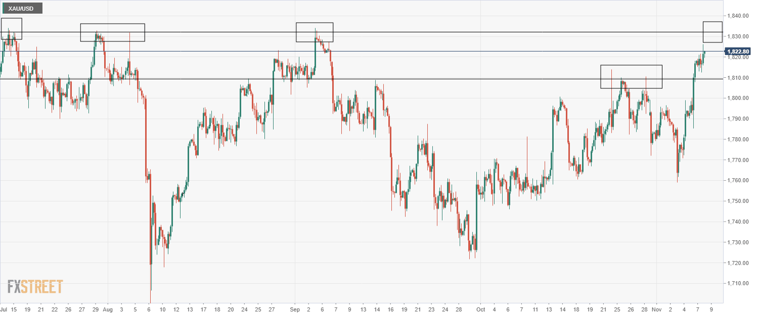 Gold Price Analysis: XAU/USD hits two-month highs above $1820 as real yields decline