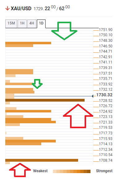 The Technical Confluences Detector is showing that gold ahs strong support at $1,728, which is the convergence of the Fibonacci 23.6% one-week, the Bollinger Band 15min-Middle, the Fibonacci 61.8% one-month and others.