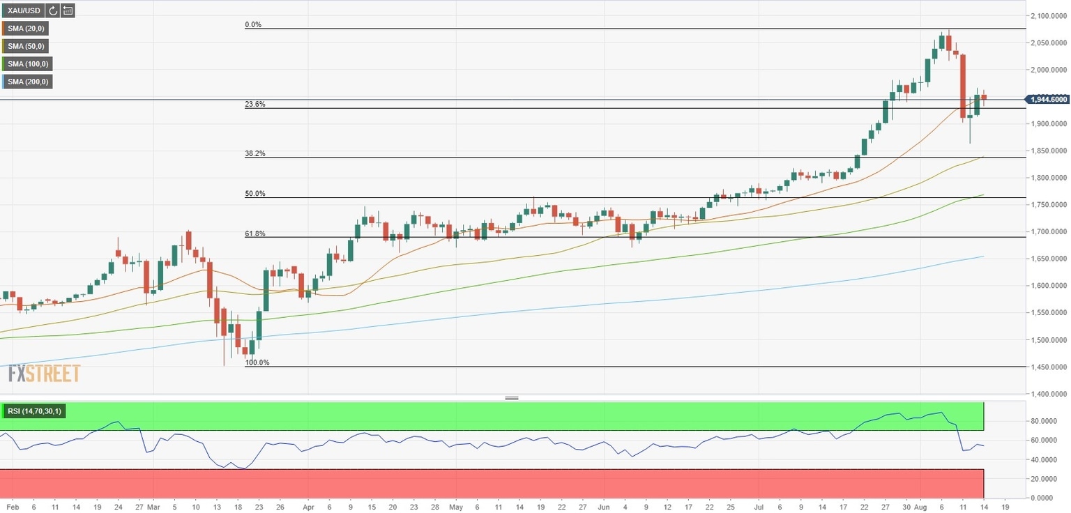 Following the sharp drop witnessed during the first half of the week, XAU/USD rose modestly on Thursday but failed to close above the 20-day SMA on Friday. On the downside, $1,930 (Fibonacci 23.6% retracement of March-August uptrend) could be seen as the first support ahead of $1,860/50 area (50-day SMA, Fibonacci 38.2% retracement, August 12 low).
