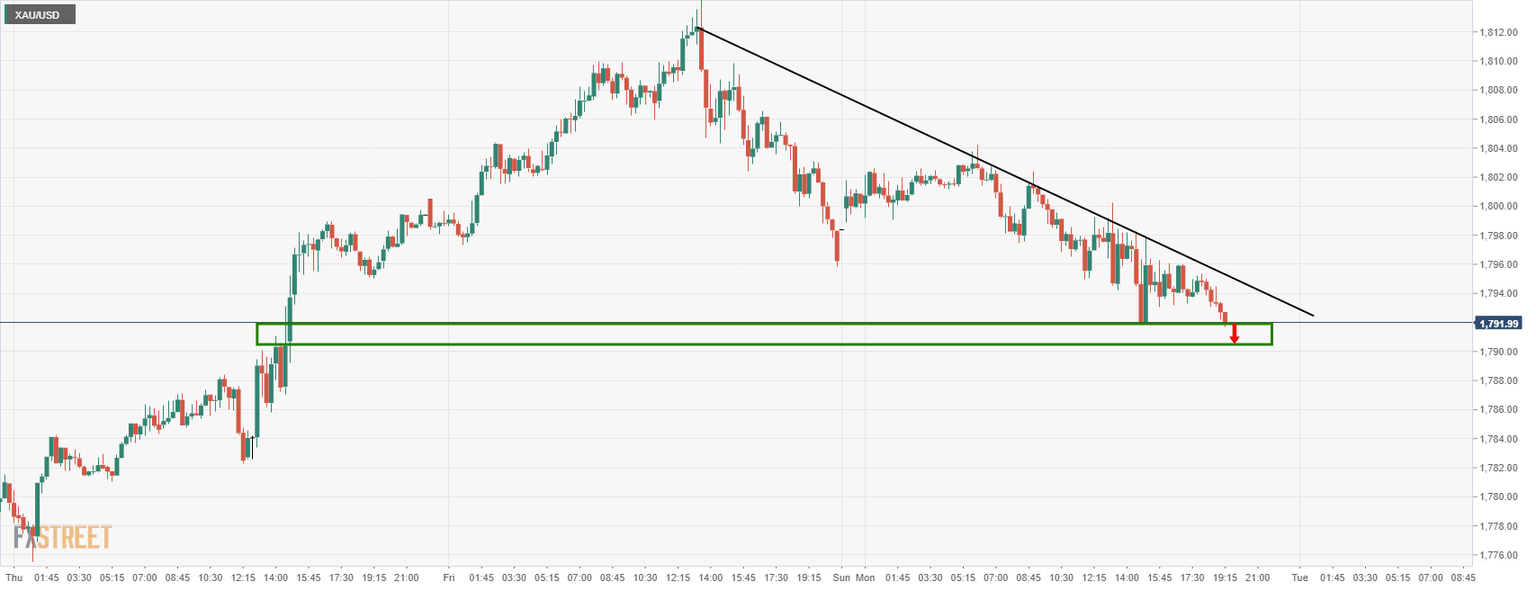 The price is embarking on the support are on the short term charts with $1,790 guarding the way to $1,780 as per the daily chart's support area: