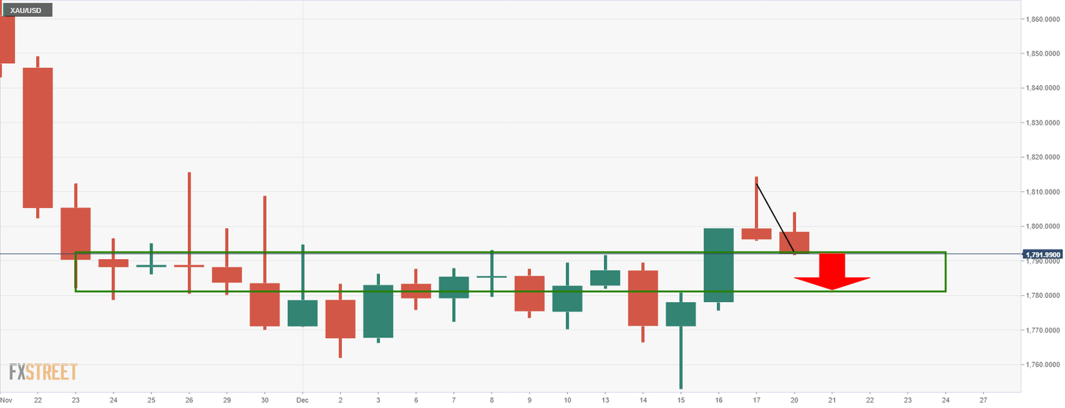 Update: The price of gold, XAU/USD, is down on the New York session by some 0.35% at the time of writing. The price has fallen from a high of $1,804.17 to a low of $1,791.78 so far. Spot trades at $1,792 as it move sin toward what would be expected to be a strong area of support as per the daily chart.'s structure below.
