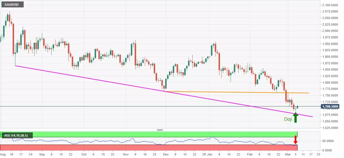Gold Price Analysis: XAU/USD wavers above $1,700 despite Friday’s Doji, oversold RSI probe bears