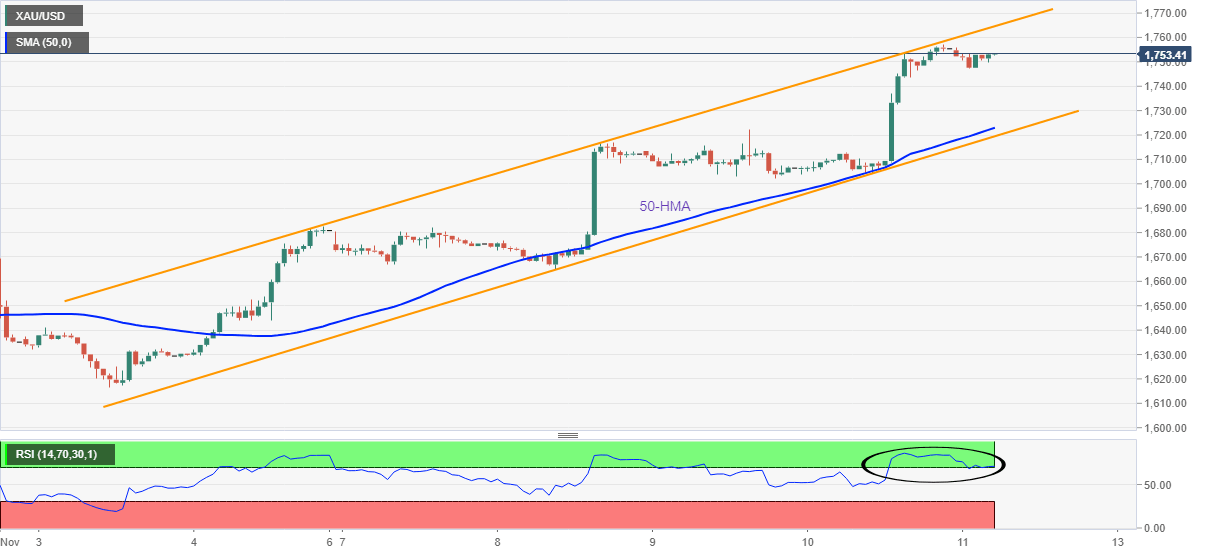 Overbought RSI conditions join the upper line of a weekly bullish channel, around $1,765 by the press time, to challenge the gold buyers.