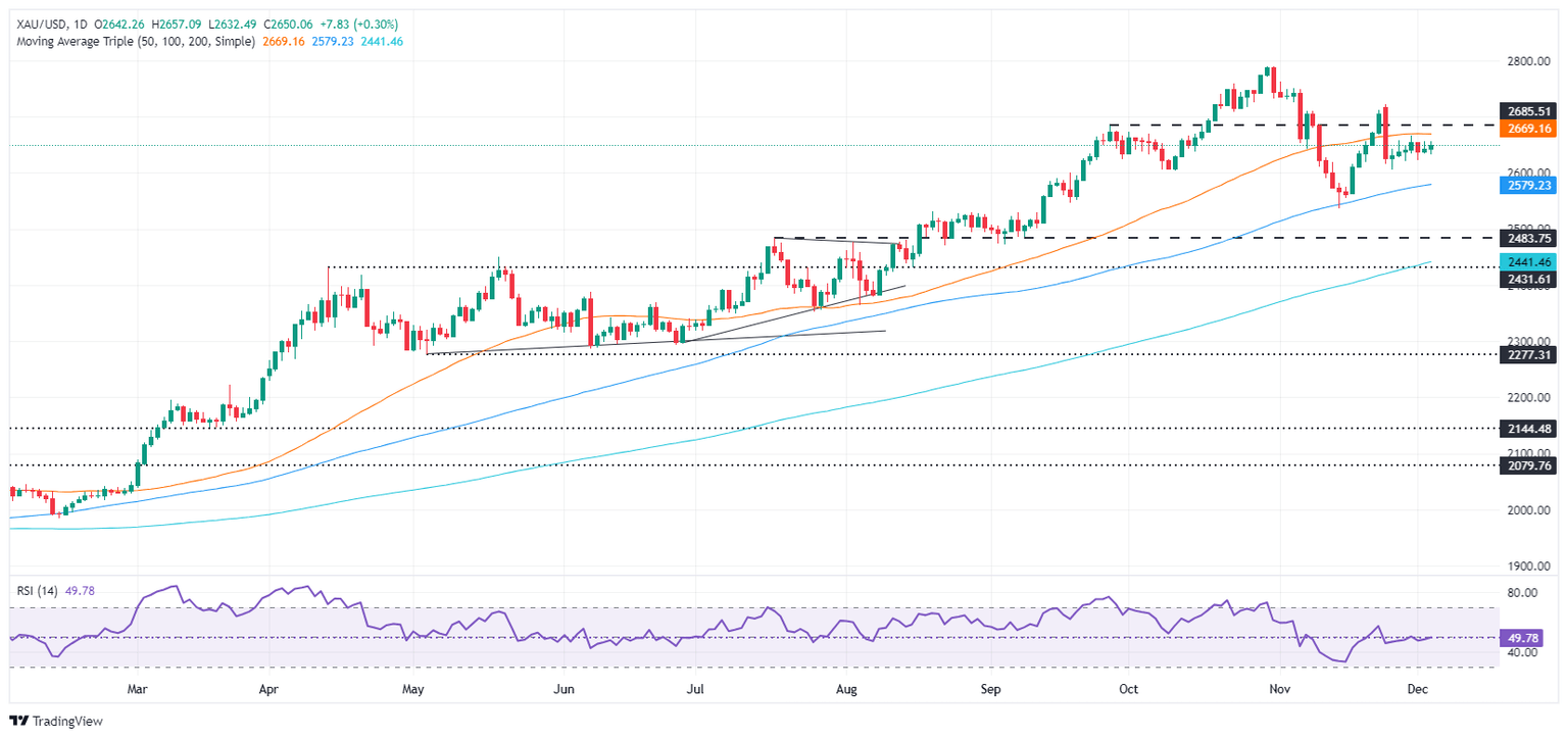 Gold remains upwardly biased yet remains subdued between $2,600 to $2,650 for the last seven days. It is capped on the upside by the 50-day Simple Moving Average (SMA) at $2,668; if it's broken, this would expose $2,700.