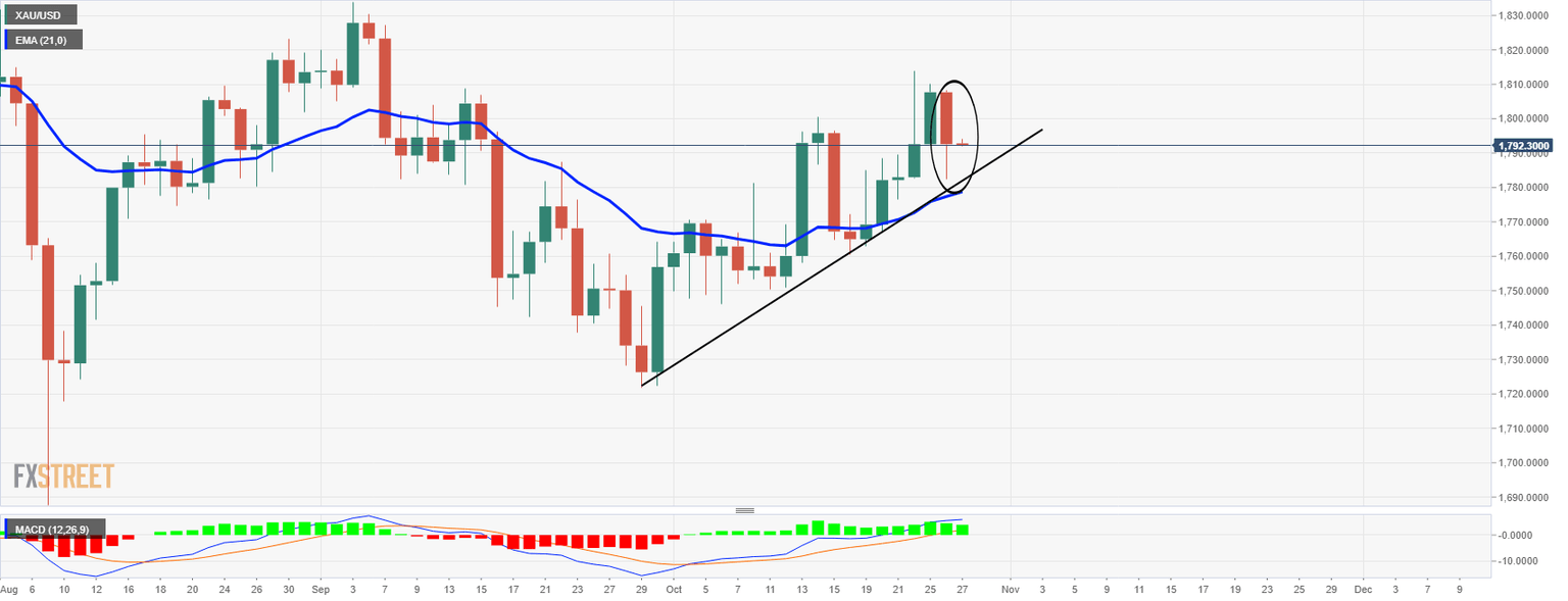 Ahead of the US Q3 GDP release, the intermarket correlations seem to have gone haywire, as the dollar rose alongside the risk-on market mood after the American tech titans reported strong corporate earnings on Tuesday. The risk appetite combined with the greenback’s surge knocked off gold price to the lowest levels in three days at $1782. Although the downside appears limited in gold price amid rising global inflation fears, in the face of surging energy prices and supply chain crisis.