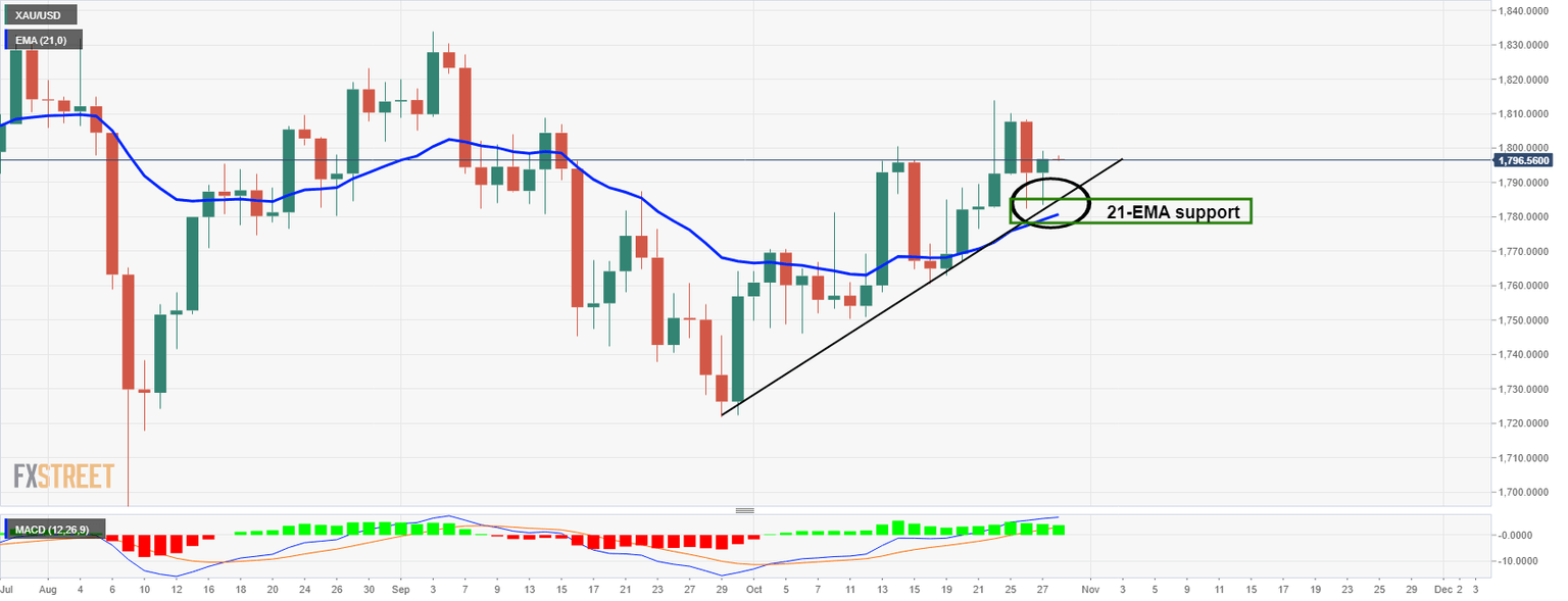 Trading at $1,796, the price of gold is flat within bullish territory on Thursday and rides daily dynamic support near the 50-day EMA. Gold is holding in a tight range mid-week while global equity markets gave up recent gains on Wednesday.