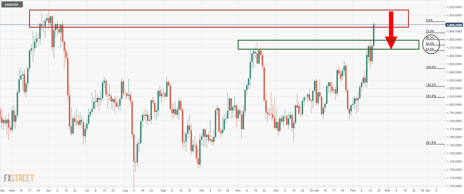 The price is attempting to break into the longer-term resistance on the daily chart. If the price fails to move through the May 2021 highs, then the focus will be back towards the $1,880's and lower with the 61.8% golden ratio in mind.