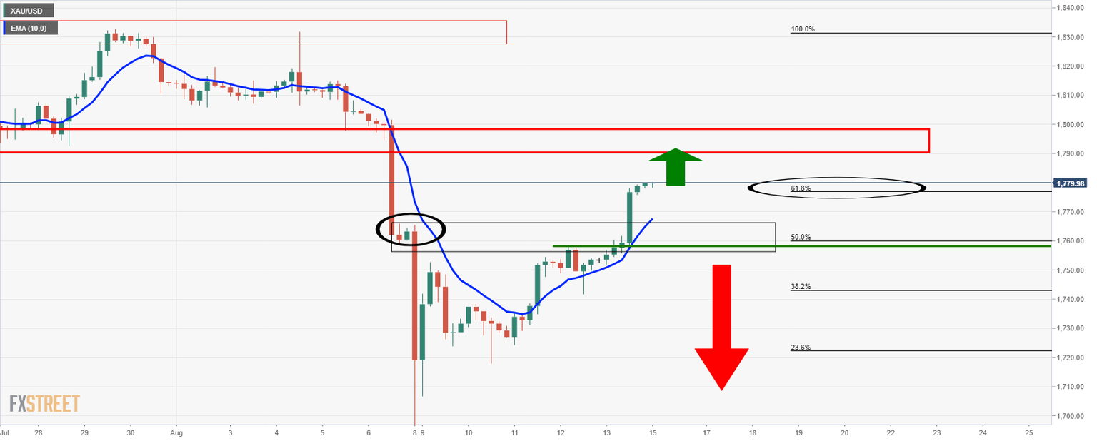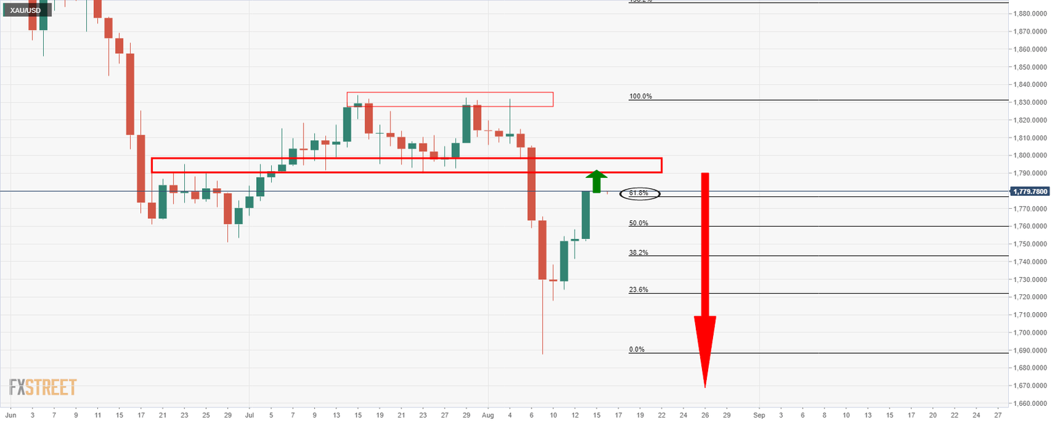 Gold has rallied through a 50% mean reversion level. The 61.8% Fibo of the drop has also been breached and bulls now eye the 78.6% Fibo at 1,798.