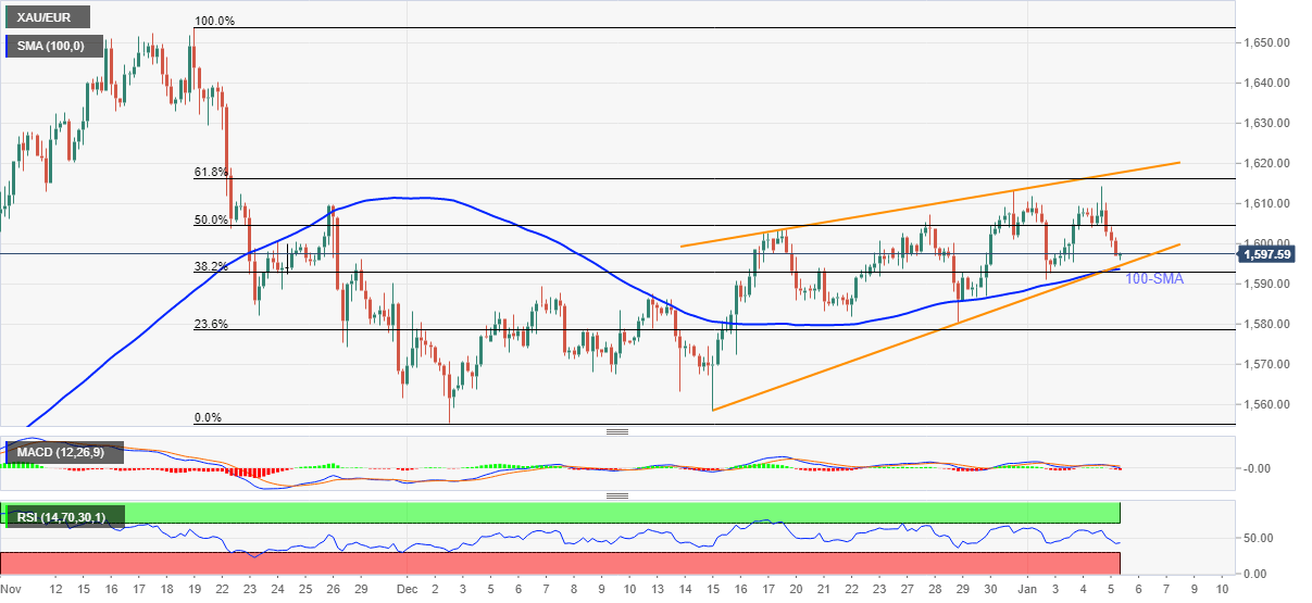 Gold prices remain pressured inside a three-week-old rising wedge bearish chart formation. Although descending RSI and bearish MACD signals keep sellers hopeful, the 100-SMA adds strength to the support line of wedge near €1,593.