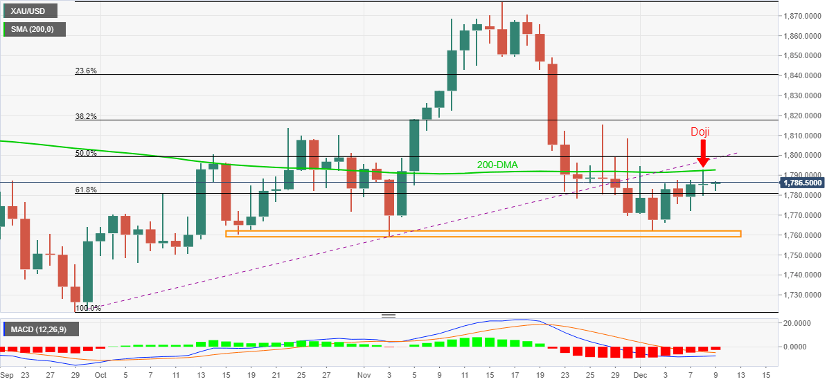 Despite bouncing off a seven-week-old horizontal area, gold stays beneath the 200-DMA, not to forget mentioning the previous support line from late September. The metal’s failures to cross short-term key hurdles join bearish MACD signals and Wednesday’s Doji candlestick to keep sellers hopeful.