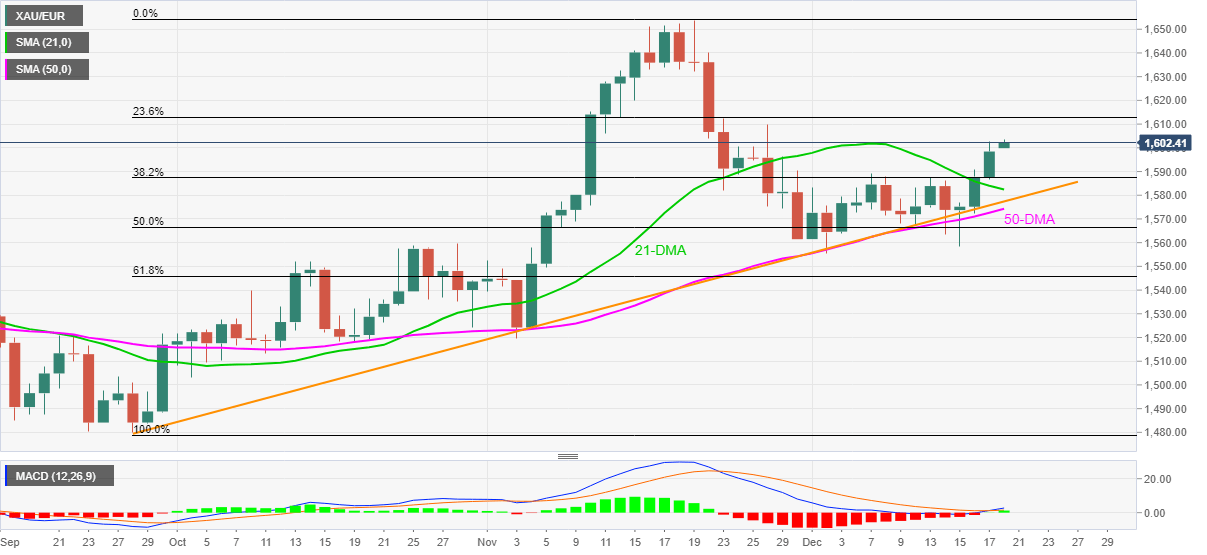The latest upside momentum eyes the 23.6% Fibonacci retracement (Fibo.) level of September-November advances, near €1,613, a break of which will need validation from €1,635 before challenging the yearly peak of €1,654.
