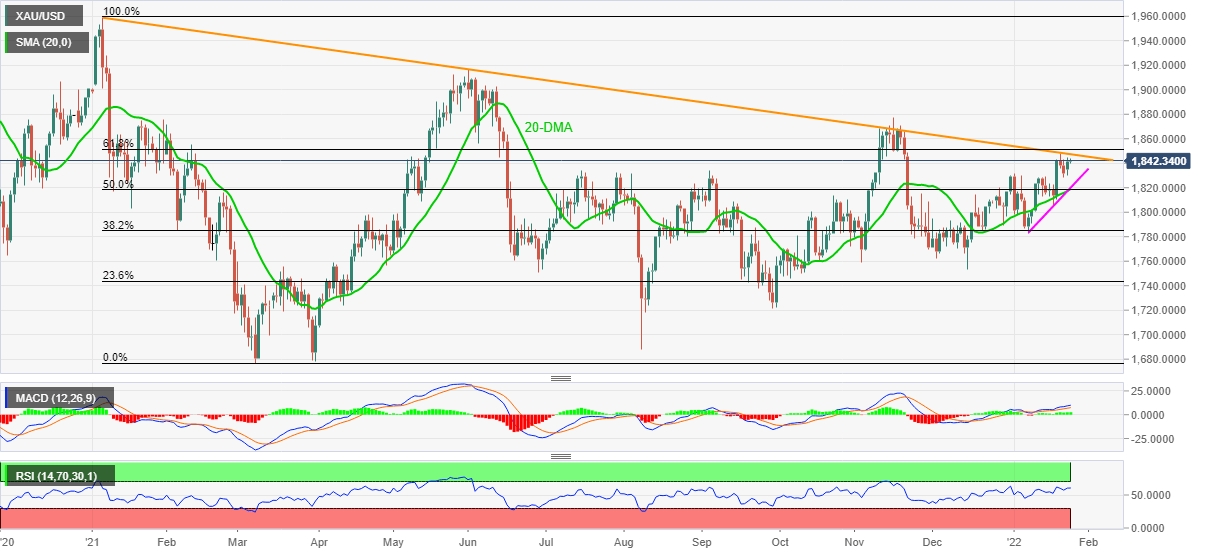 Previous update: Gold (XAU/USD) holds on to the week-start rebound towards the yearly resistance line, dribbles around $1,842 during early Tuesday morning in Europe.