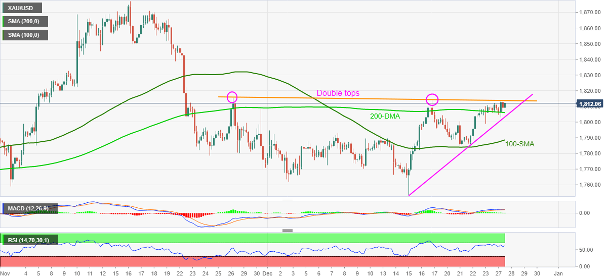Gold (XAU/USD) remains firmer around $1,812 during Tuesday’s Asian session, after refreshing the weekly peak the previous day. The yellow metal cheers the market’s risk-on mood, as well as downbeat US dollar prices, to keep buyers hopeful during the final days of 2021.