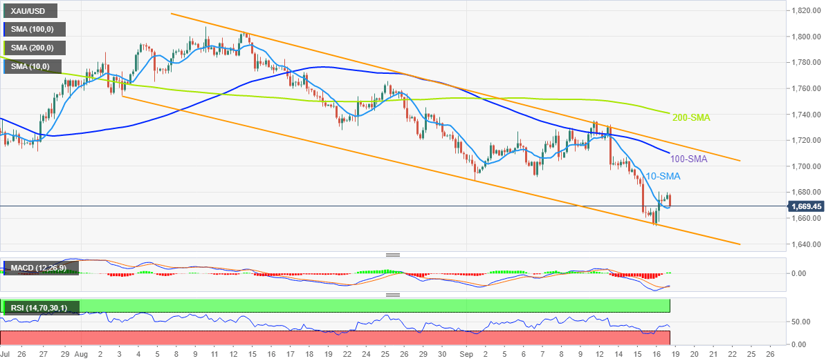Gold price remains inside a six-week-old bearish channel, holding lower grounds of late. In doing so, the XAU/USD also reverse the previous day’s upside break of the 10-SMA, around $1,668 by the press time.