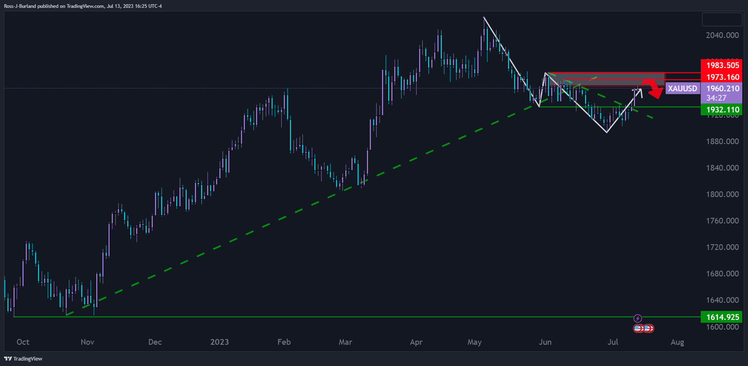 - Gold price bears eye the 61.8% ratio to the downside in line with $1,932 support.
