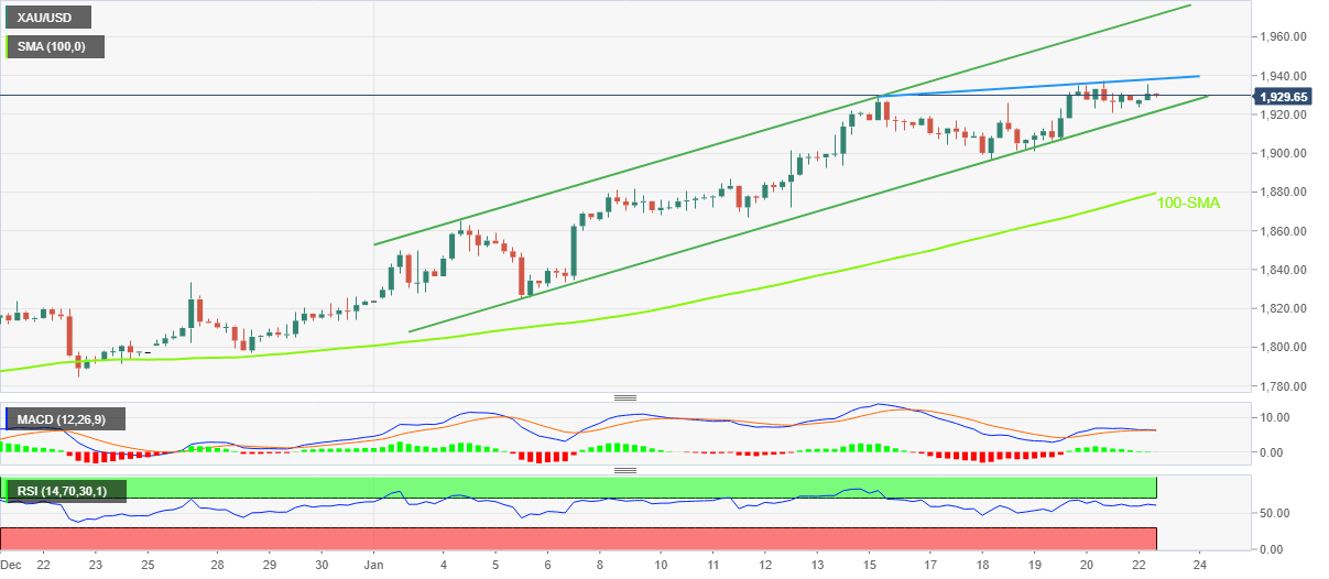 Gold price (XAU/USD) dodders around the $1,930 mark as bulls keep the reins after a five-week uptrend, printing mild gains to reverse the previous day’s pullback. In so doing, the precious metal aptly depicts the market’s conditions amid a light calendar and absence of Chinese traders, not to forget that Federal Reserve (Fed) policymakers are off stage during the pere-FOMC blackout.