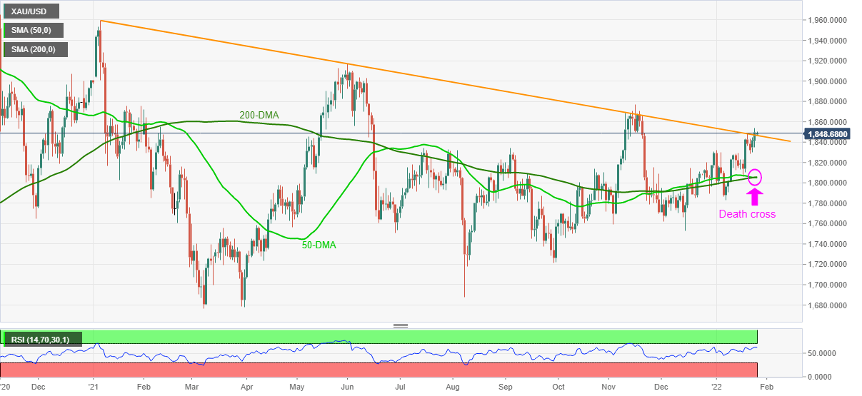 The bullish bias also takes clues from the upbeat RSI line, not overbought, as well as the metal’s rejection to ‘Death Cross”, a moving average bearish crossover.