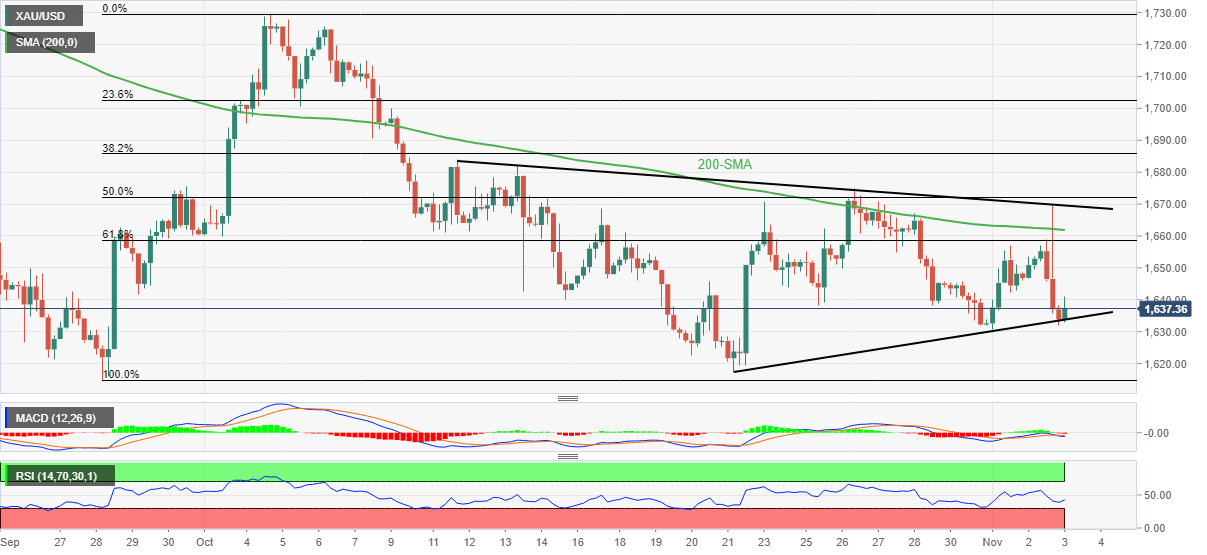 Gold price justifies the sluggish MACD and RSI (14) while flirting with the fortnight-old support line, around $1,633 by the press time.