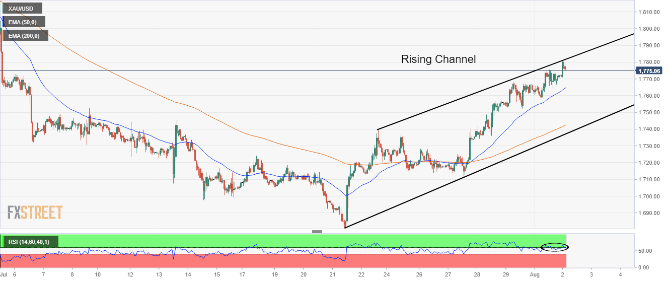 Gold price (XAU/USD) has corrected t near $1,774.65 after printing a high of $1,780.58 in the early Tokyo session. The precious metal is likely to rebound again as an upside break of consolidation is followed by a low-volume test of the breakout. Earlier, the bright metal displayed an upside break of the consolidation formed in a $1,764.45-1,775.35 range.