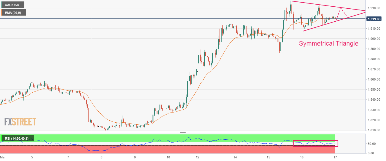Gold price is auctioning in a Symmetrical Triangle chart pattern on an hourly scale, which indicates a squeeze in volatility that is followed by an expansion in the same. The downward-sloping trendline of the aforementioned chart pattern is placed from March 15 high around $1,939.40 while the upward-sloping trendline is placed from March 16 low at $1,907.56.
