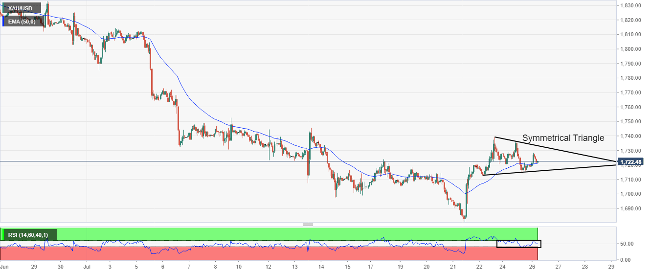 On an hourly scale, the gold price is auctioning in a symmetrical triangle pattern. The upward and downward-sloping trendline of the volatility contraction pattern is placed from July 22 low and high at $1,712.94 and $1,739.37 respectively. The above-mentioned chart pattern indicates a volatility squeeze, which will be followed by an expansion in volumes and candlesticks’ range.