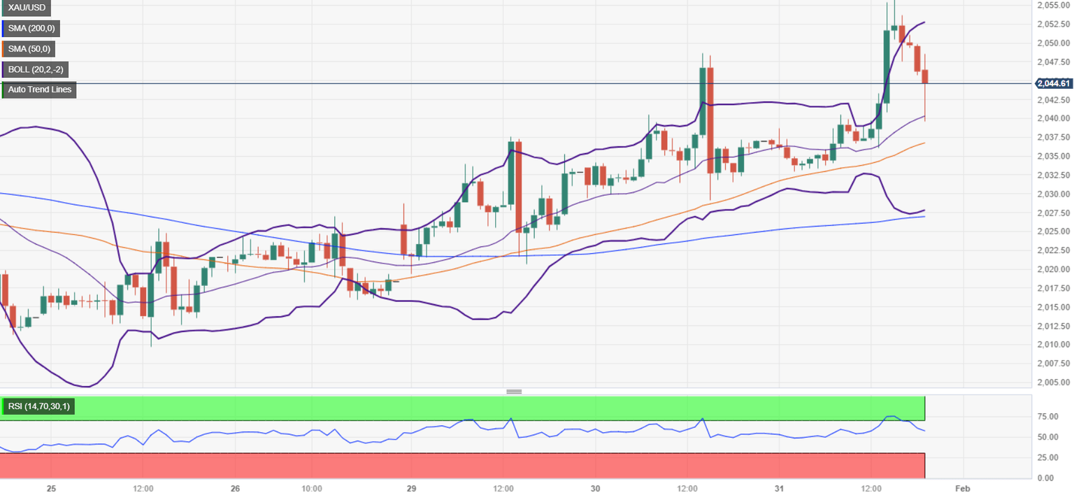 Gold price trims earlier gains and retreats after the US Federal Reserve decided to keep rates unchanged while pushing back against speculation of rate cuts. At the time of writing, XAU/USD trades volatile within the $2030 - $2050 area as market participants await Fed Chairman Jerome Powell’s decision.