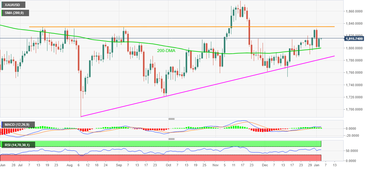 Gold stays above 200-DMA with firmer MACD and RSI adding to the bullish bias targeting another battle with the $1,834 hurdle comprising tops marked during July and September.