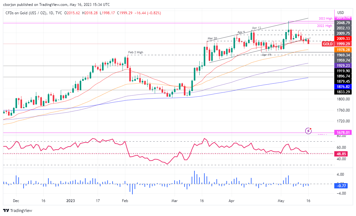 XAU/USD remains in a neutral bias, albeit exchanging hands above the 50, 100, and 200-day Exponential Moving Averages (EMAs), each at $1978.42. Nevertheless, since reaching a year-to-date (YTD) high of $2081.82, XAU/USD retraced sharply, below the April 13 high of $2048.79, which opened the door for a deeper pullback. Since then, XAU/USD has fallen more than 3.5%, with sellers eyeing to extend its losses past the $2000 mark. Once cleared, the next support for XAU/USD would be the 50-day EMA at $1978.43 before Gold tests the April 19 swing low of $1969.34.