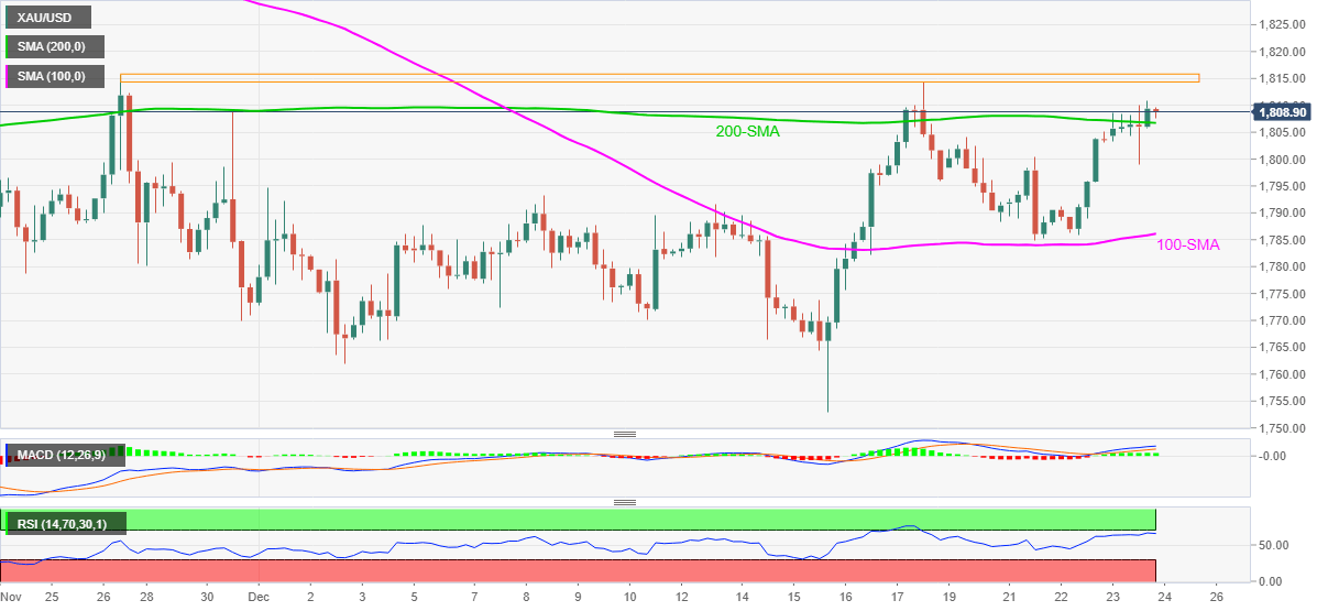 Gold (XAU/USD) prices hang in balance around $1,809, after refreshing the week’s high to $1,810 the previous day. In doing so, the yellow metal shows the typical market inactivity during Christmas Eve.