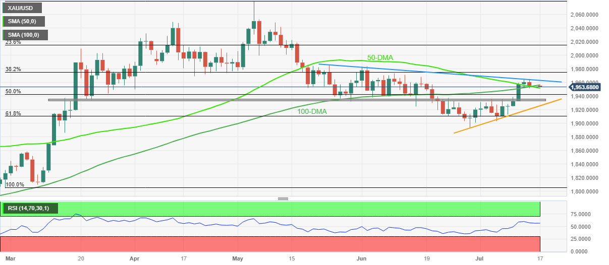 Gold Price (XAU/USD) prints mild losses around $1,953 as it extends Friday’s retreat from the short-term key resistance line amid the early hours of Monday’s Asian session. In doing so, the XAU/USD consolidates the biggest weekly gain since early April amid the Federal Reserve (Fed) blackout ahead of late July’s monetary policy meeting. Also allowing the Gold buyers to take a breather are the weekend headlines surrounding China, the latest data from the United States and cautious mood ahead of top-tier statistics from Beijing.