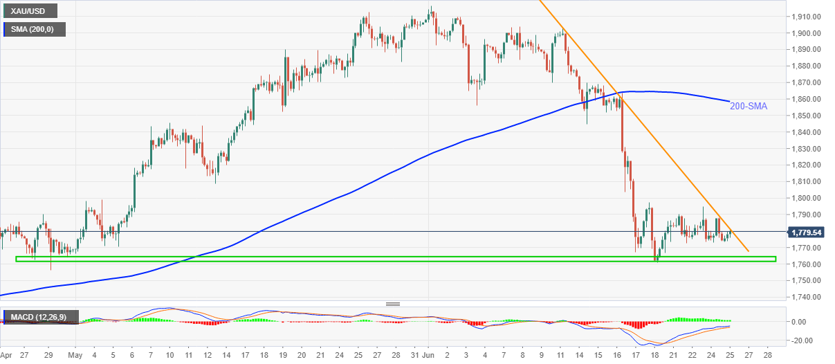 Update: Gold is picking up the bid tone in European trading, taking advantage of the retreat in the US Treasury yield and the dollar across the curve. The risk-off action in the European equities, amid rising concerns over the rapid spread of the Delta plus covid strain, lifts gold’s safe-haven appeal. At the time of writing, gold price is advancing 0.45% on the day to trade at $1784, poised for the first weekly gain in four. Despite the rebound, gold’s upside appears capped around $1794 ahead of the US PCE Inflation data, which shed more light on the inflation picture and the Fed’s next policy move.