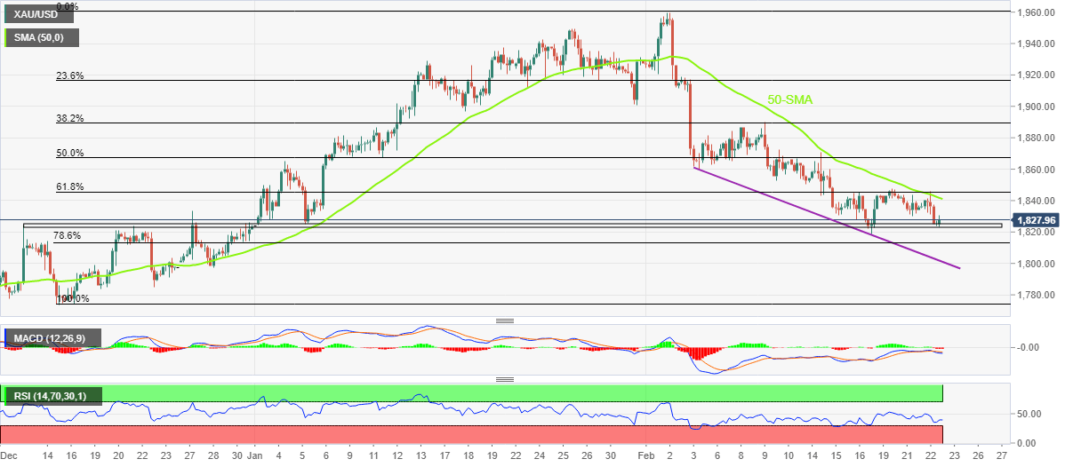 Gold price rebounds from a six-week-old horizontal support zone, around $1,825-23, amid an uptick of the RSI (14) line and sluggish MACD signals. However, the 50-Simple Moving Average (SMA) level surrounding $1,842, guards the immediate upside of the XAU/USD.