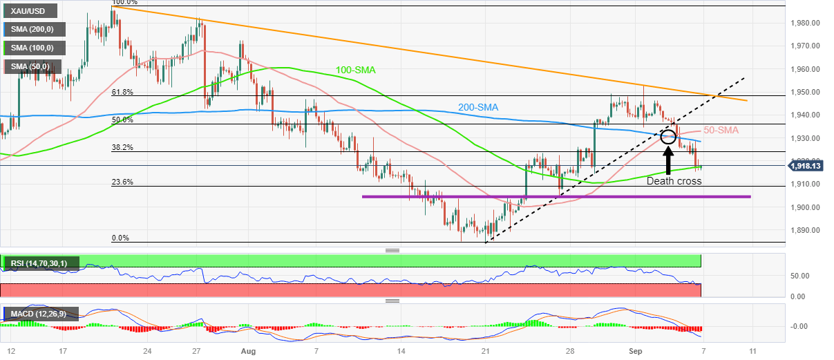 Gold Price (XAU/USD) portrays a corrective bounce from one-week low to $1,918 amid the initial hours of Thursday’s Asian session, after declining in the last five consecutive days. In doing so, the bright metal seeks more clues to defend the latest downside despite being bearish amid firmer US Dollar and the United States Treasury bond yields, not to forget fears emanating from China.