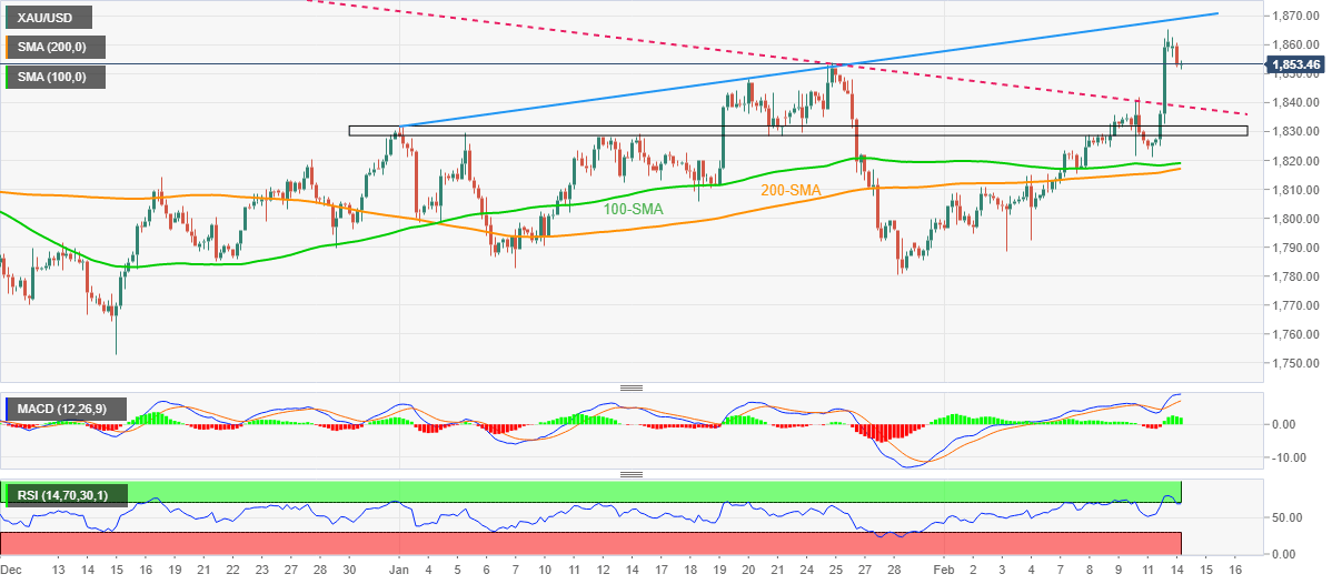 Although nearly overbought RSI conditions triggered gold’s recent pullback, the metal sellers will undoubtedly wait for a clear downside break of the previous resistance line, near $1,850 to convince markets.