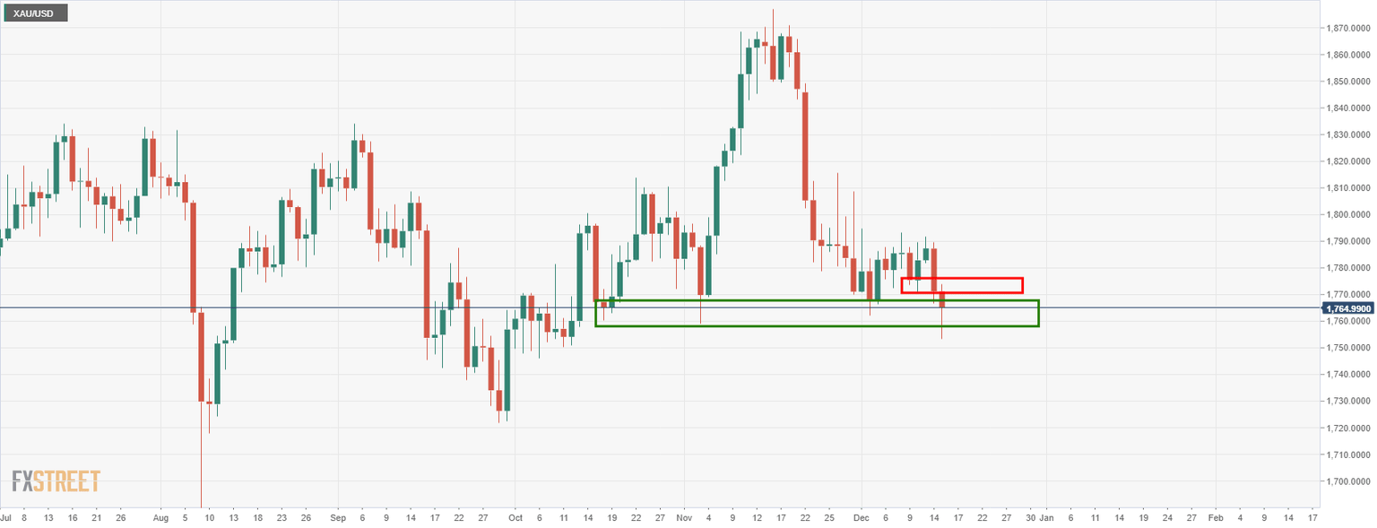 Gold, XAU/USD has extended the day's losses on an uber hawkish Federal Reserve statement and announcements of a doubling of its tapering of QE and a seismic shift in the dot plot. The median forecast is now showing three hikes in 2022 and 2023. In the September Dots, the median saw only one hike by end-2022 (0.375%).