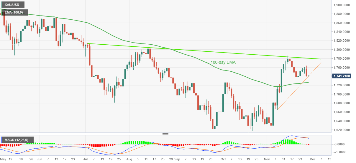 Gold price attacks a three-week-old ascending support line, near $1,740 by the press time, amid the bearish MACD signals.