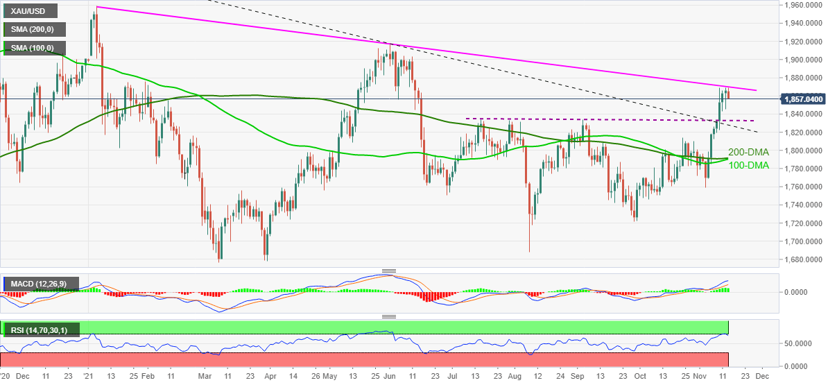Previous update: Gold (XAU/USD) licks wounds near $1,860 during the first negative day in eight amid early Monday. In doing so, the yellow metal eases from the highest levels since June while stepping back from the yearly resistance line. That said, the pullback moves fail to cheer softer US Treasury yields, as well as the US dollar, amid mixed sentiment.