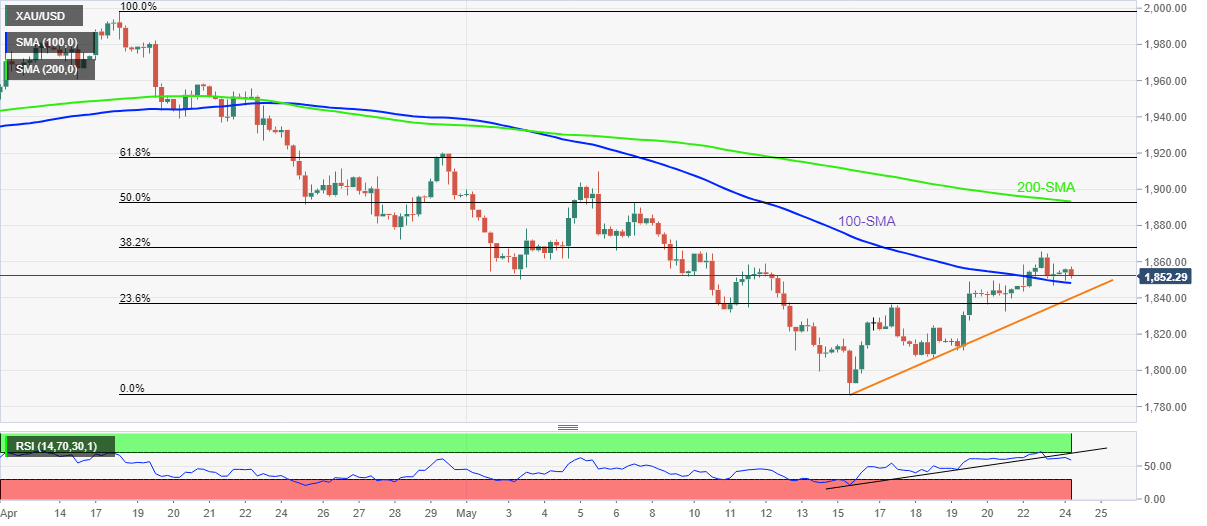 Gold (XAU/USD) prices remain pressured around the intraday low near $1,850 as sellers struggle to re-enter amid a risk-off mood during the pre-European session trading on Tuesday.
